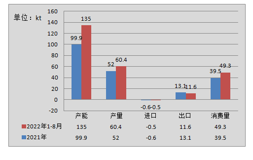 據統計,截至2022年8月份,國內六氟磷酸鋰投產總產能已達到13.5萬噸,較2021年底產能增長3.6萬噸,提升了36%。從目前項目進展來看,預計到2022年底,國內六氟磷酸鋰總產能將到達15.4萬噸,全年產量有望突破10萬噸。另外,除國內需求,我國還是六氟磷酸鋰的凈出口國,2021年全年凈出口量為1.25萬噸,2022年1-9月凈出口量達到1.11萬噸,出口量也在不斷增長。