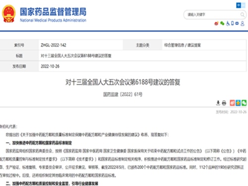 您提出的《關于加強中藥配方顆粒質量標準制定保障中藥配方顆粒產業健康持續發展的建議》收悉,現答復如下:
