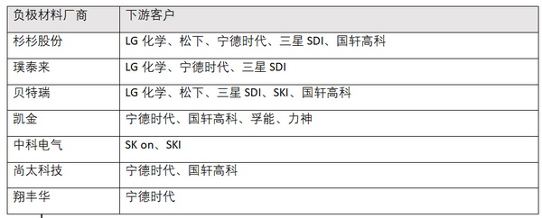 從各負(fù)極材料企業(yè)下游客戶結(jié)構(gòu)來看,頭部負(fù)極材料企業(yè)多與寧德時代、松下、LG化學(xué)等頭部電池廠商深度綁定。