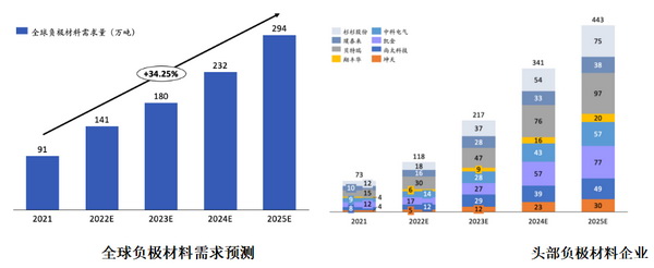 未來在新能源車以及儲能領(lǐng)域快速發(fā)展的帶動下,負(fù)極材料的需求仍呈現(xiàn)高速增長態(tài)勢。預(yù)計2025年全球負(fù)極材料需求將達(dá)到294萬噸。從各頭部廠家的產(chǎn)能布局來看,頭部負(fù)極材料企業(yè)產(chǎn)能總計達(dá)443萬噸。