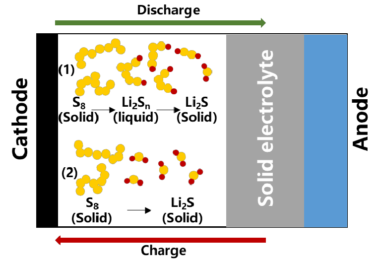 液態鋰硫電池與固態鋰硫電池的充放電機理示意圖(來源:李文文,《PEO基聚合物電解質的改性及其全固態鋰硫電池界面研究》)