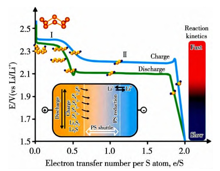 鋰硫電池理想的充放電曲線(插圖為穿梭效應)(來源:馮陽等,《高性能鋰硫電池研究進展與改進策略》)