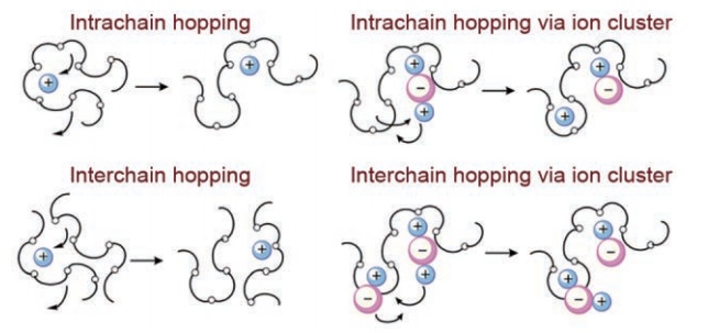 將鋰鹽溶解到有機聚合物基體中得到具有離子導電性的聚合物電解質。聚合物電解質的基體主要有聚環氧乙烷(PEO)、聚環氧丙烷(PPO)、聚甲基丙烯酸甲酯(PMMA)、聚丙烯腈(PAN)、聚氯乙烯(PVC)、聚偏二氟乙烯(PVDF)、聚碳酸丙烯酯(PPC)等。目前,聚氧化乙烯(PEO)聚合物基體在固態鋰硫電池中的研究最為廣泛。其中PEO被公認的離子傳輸機理:Li+和PEO鏈上的—C—O—C—不斷地發生絡合-解絡合反應,通過PEO的鏈段運動完成Li+的遷移。