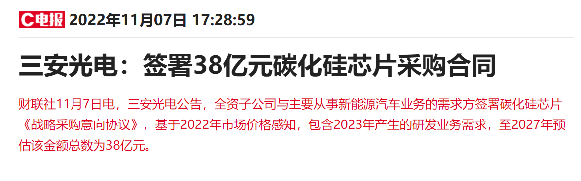 中國粉體網訊 總市值超900億元的LED芯片龍頭三安光電昨日下午公告,全資子公司與主要從事新能源汽車業務的需求方簽署碳化硅芯片《戰略采購意向協議》,基于2022年市場價格感知,包含2023年產生的研發業務需求,至2027年預估該金額總數為38億元。