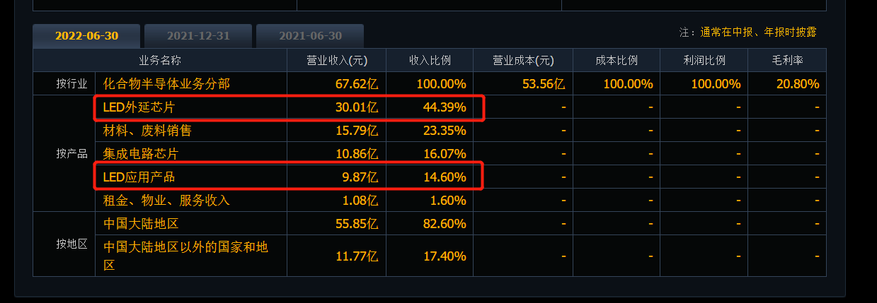 公開資料顯示,三安光電是國內最大全色系超高亮度LED芯片生產企業,國內光電領域龍頭。據半年報數據顯示,三安光電LED外延芯片和LED應用產品占營收比例合計近60%。