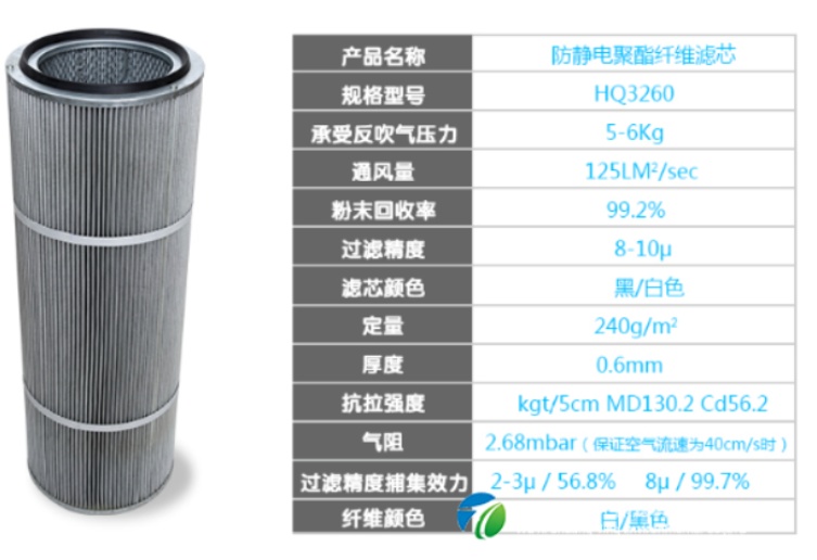 此濾料產品特性:此濾料包含了普通滌綸針刺氈的特性,強度大、彈性回復性能好、織物尺寸穩定、耐磨性能好、空隙率大,透氣性能較好,使用壽命長,除塵效果好,常溫(低于130℃)下有良好的力學性能和耐酸堿性。因基布含有導電纖維,因此具備了良好的導電。