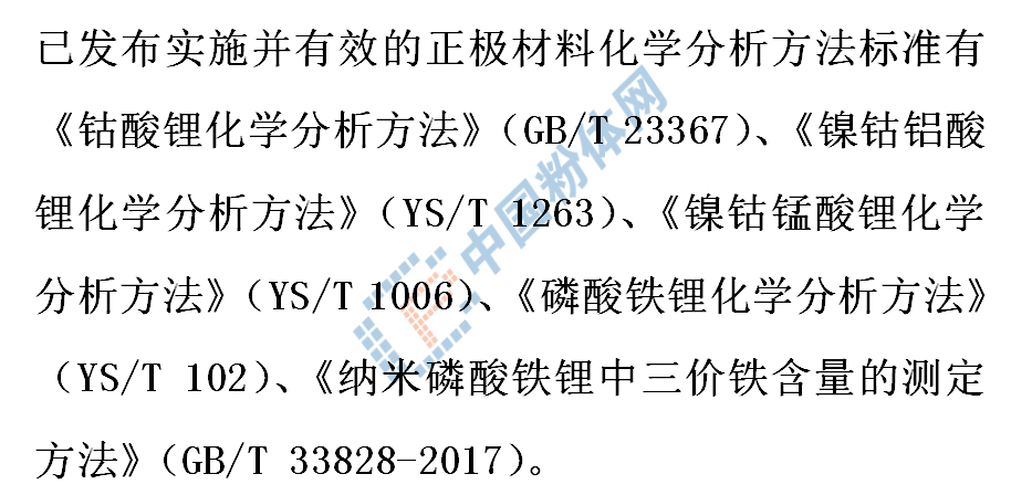 現階段已發布實施并有效的正極材料產品標準有《鈷酸鋰》(GB/T 20252)、《錳酸鋰》(YS/T 677)、《磷酸鐵鋰》(YS/T 1027)、《納米磷酸鐵鋰》(GB/T 33822)、《鋰離子電池用炭復合磷酸鐵鋰正極材料》(GB/T 30835)、《鎳鈷錳酸鋰》(YS/T 798)、《鋰離子電池用鎳鈷鋁酸鋰》NCA(T/CIAPS 00 08)、《鋰離子電池用一次顆粒狀鎳鈷鋁酸鋰》(T/CESA 1065)、《鎳鈷鋁酸鋰》(YS/T 1125)、《NCM 523型鎳鈷錳酸鋰》(T/CNI A0043)、《NCM 622型鎳鈷錳酸鋰》(T/CNIA 0044)、《NCM 811型鎳鈷錳酸鋰》(T/CNIA 0045)、《大單晶鎳鈷錳酸鋰NCM523》(T/GZHG 006)、《鋰離子電池用一次顆粒狀鎳鈷錳酸鋰》(T/CESA 1065)、《鎳酸鋰》(GB/T 26031)、《鎳錳酸鋰》(GB/T37202)、《富鋰錳基正極材料》(YS/T 1030)。