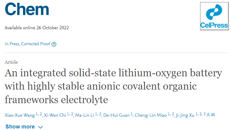 中國粉體網訊 日前,吉林大學化學學院、無機合成與制備化學國家重點實驗室、未來科學國際合作聯合實驗室徐吉靜教授團隊在固態鋰電池領域取得重要進展,該研究成果以“An integratedsolid-state lithium-oxygen battery with highly stable anioni ccovalent organic frameworks electrolyte”為題發表于《Chem》上(Chem, 2022, DOI:10.1016/j.chempr. 2022.09.027)。吉林大學鼎新學者王曉雪博士為論文第一作者,徐吉靜教授為論文通訊作者。