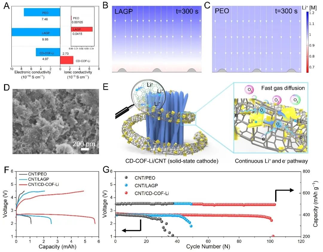 圖:a)CD-COF-Li、LAGP和PEO的電子電導率和離子電導率值;b-c)有限元模擬;d)掃描電鏡圖片;e)固態正極的設計原理圖;f)放電容量測試;g)循環壽命測試。