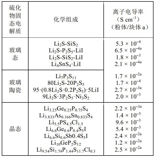 硫化物固態電解質通常以晶體結構劃分為玻璃態、玻璃陶瓷態和晶態。其中,Li3.25Ge0.25P0.7S4屬于thio-LISICON型硫化物固態電解質,Li6PS5X(X=Cl,Br,I)屬于Li-argyrodite型固態電解質,Li10GeP2S12屬于LGPS型固態電解質。