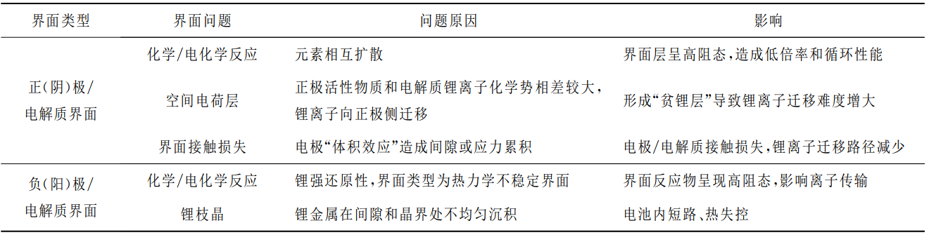 硫化物固態電解質相對較高的室溫離子電導率使得其成為固態電池重要的備選材料。進一步提高硫化物固態電解質穩定性是發揮其在離子電導率方面優勢的關鍵。硫化物固態電池內部存在的界面問題制約著其應用。常見的界面問題如表2所示,界面問題的存在使得硫化物全固態電池極化嚴重、容量低、循環能力差等問題更加突出。