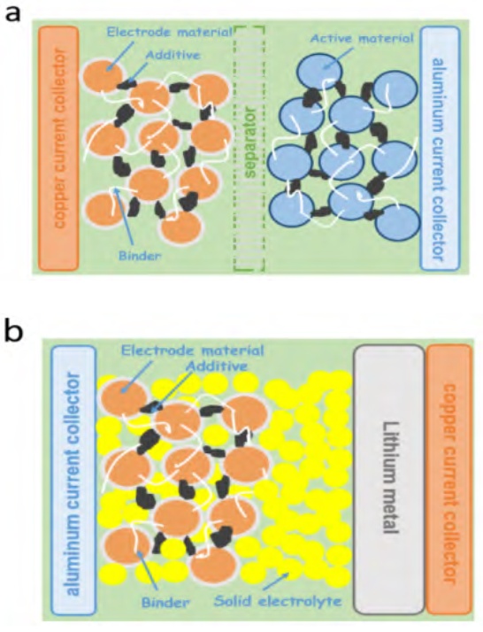 圖3a.傳統的鋰離子電池結構示意圖b.硫化物全固態電池結構示意圖