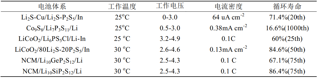 由于硫化物全固態電池還沒有實現商業化,表3為近年來部分高校與科研單位研制的硫化物全固態電池結果,表中有電池體系、工作溫度以及電池的循環性能。由于目前各實驗室內的全固態電池在正極活性物質/固態電解質配比,固態電解質層厚度以及電池組裝方法上都有較大差異,因此實驗結果僅有部分參考價值。從表中可以看出,目前硫化物全固態電池的實驗室產品循環性能較差,大部分都在100圈以下,界面處理、電池組裝工藝以及固態電解質本身都需要進一步優化。