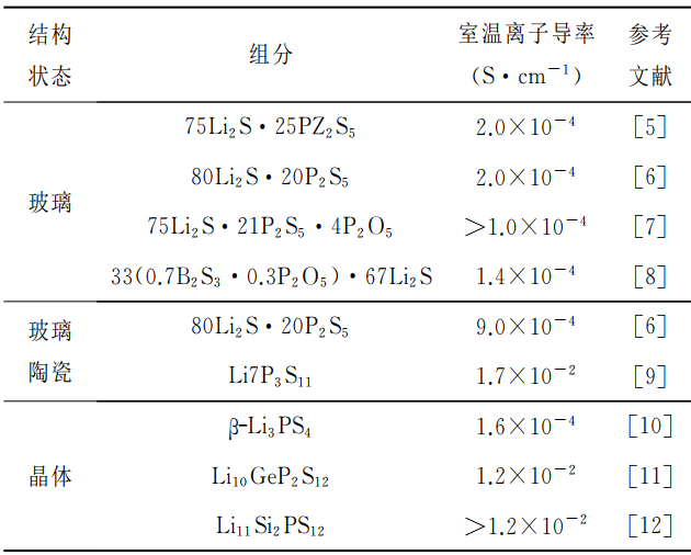 硫化物固體電解質按結晶形態可分為硫化物玻璃、玻璃陶瓷固體電解質及晶體固體電解質。其中,玻璃陶瓷可由玻璃經過退火處理后獲得,晶體類可以由異價元素取代獲得。表1給出各主要類型硫化物固體電解質代表及其室溫下電導率。