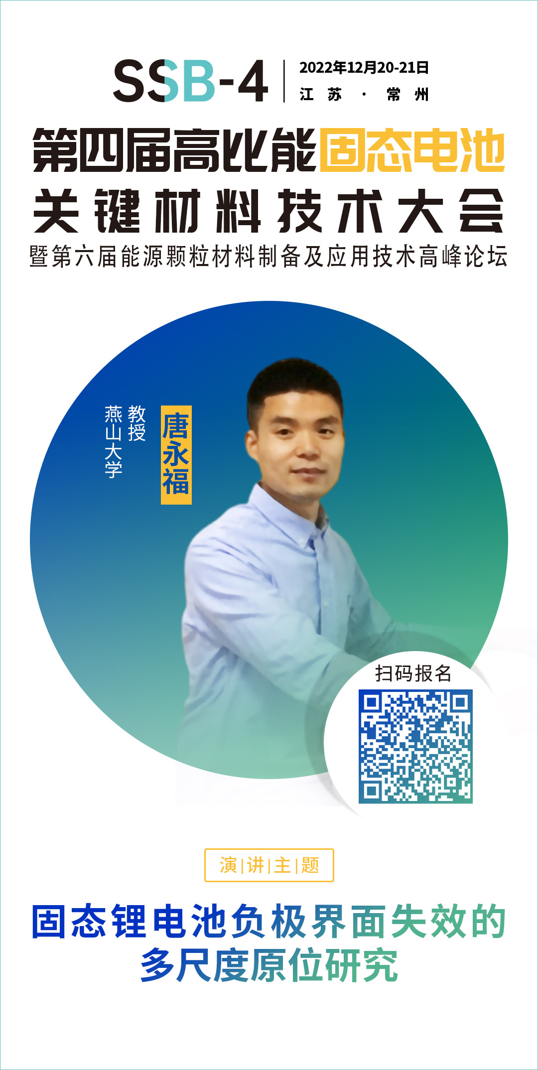 針對(duì)固態(tài)電池相關(guān)的技術(shù)、材料、市場(chǎng)及產(chǎn)業(yè)等方面的問題,中國(guó)粉體網(wǎng)將于12月20-21日在常州舉辦第四屆高比能固態(tài)電池關(guān)鍵材料技術(shù)大會(huì),為致力于固態(tài)電池技術(shù)開發(fā)的企業(yè),科研院校,以及電動(dòng)車、儲(chǔ)能、特種應(yīng)用等終端企業(yè)提供信息交流的平臺(tái),開展產(chǎn)、學(xué)、研合作,共同推動(dòng)行業(yè)發(fā)展。屆時(shí),燕山大學(xué)唐永福教授將作題為《固態(tài)鋰電池負(fù)極界面失效的多尺度原位研究》的報(bào)告。報(bào)告將介紹近年來(lái)通過原位透射電鏡、原位掃描電鏡等多尺度可視化手段對(duì)鋰枝晶及負(fù)極界面失效力-電-化學(xué)耦合特性的原位研究,直觀解析不同固態(tài)電池體系鋰枝晶的形成及演化機(jī)制,提出鋰枝晶抑制的可能策略,為長(zhǎng)壽命、高安全固態(tài)鋰電池的設(shè)計(jì)與開發(fā)提供參考。