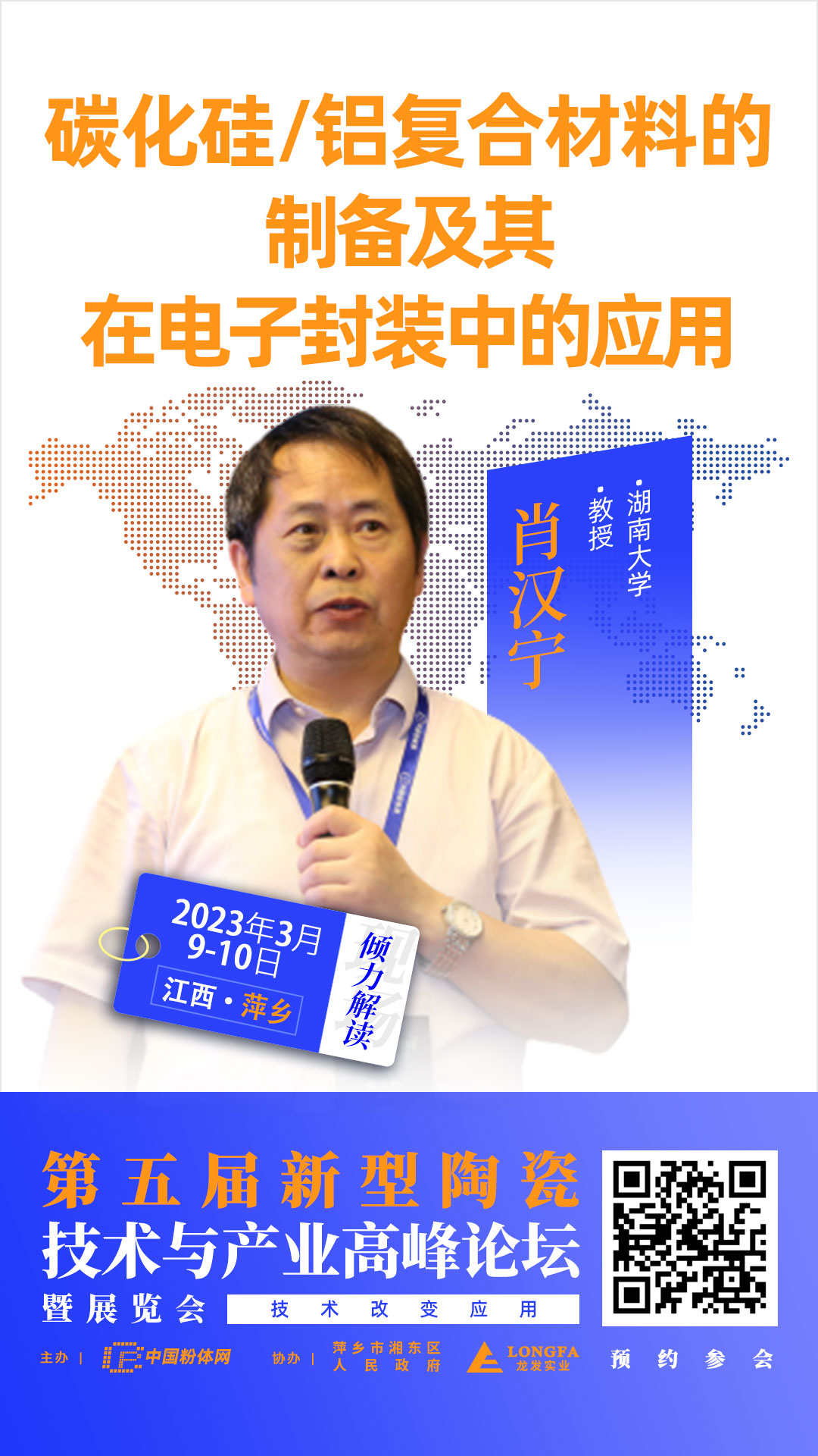 在此背景下,中國粉體網將于2023年3月9-10日在江西萍鄉舉辦“2022第五屆新型陶瓷技術與產業高峰論壇”,我們邀請到湖南大學肖漢寧教授將作題為《碳化硅/鋁復合材料的制備及其在電子封裝中的應用》的報告。屆時,肖漢寧教授將對SiCp/Al復合材料及其在電子封裝中的應用進行介紹,并對其關鍵制備技術進行詳細闡述。