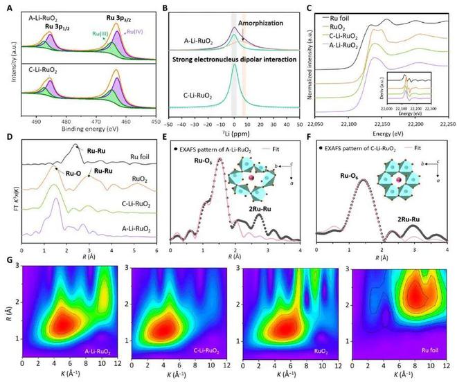 基于上述挑戰(zhàn),王家鈞教授團(tuán)隊(duì)首次提出通過調(diào)節(jié)晶相結(jié)構(gòu)修飾局域電子——離子傳輸行為,構(gòu)筑具有獨(dú)特結(jié)構(gòu)的SSC目標(biāo),采用低溫?zé)崽幚矸椒ㄖ苽淞司哂虚L程無序結(jié)構(gòu)的非晶釕酸鋰(A-Li-Ru-O)復(fù)合材料,團(tuán)隊(duì)發(fā)現(xiàn)該材料可以顯著提升電子、離子傳輸動(dòng)力學(xué),并結(jié)合理論計(jì)算得出,非晶結(jié)構(gòu)中的多維擴(kuò)散有助于其電子、離子傳輸行為。團(tuán)隊(duì)通過進(jìn)一步研究發(fā)現(xiàn),擔(dān)載非晶釕酸鋰(A-Li-Ru-O)的SSLOB器件展現(xiàn)了優(yōu)異的放電比容量和循環(huán)性能,基于同步輻射X射線吸收譜、同步輻射X射線斷層成像等技術(shù)研究得出,該無序材料除了具有高效的離子、電子傳輸動(dòng)力學(xué),還可以在充放電過程中分別加速過氧化鋰(Li2O2)的分解和超氧化鋰(LiO2)的電化學(xué)轉(zhuǎn)化。