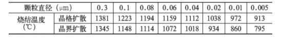粉體顆粒尺寸與燒結(jié)溫度的關(guān)系(燒結(jié)擴(kuò)散活化能Q=418KJ/mol)