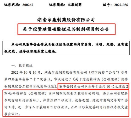 中國粉體網(wǎng)訊 近日上市藥企爾康制藥(300267.SZ)發(fā)布《關(guān)于投資建設(shè)碳酸鋰及其制劑項目的公告》。公告稱,公司董事會同意以自籌資金約10億元建設(shè)2萬噸/年精神類(含碳酸鋰)固體制劑及配套工程項目的規(guī)劃,要求公司管理層在現(xiàn)有項目論證基礎(chǔ)上,抓緊組織工程設(shè)計、設(shè)備選型、建設(shè)方案確定等對外咨詢工作,進一步深入開展項目可行性論證,并早日形成完善的可行性報告。