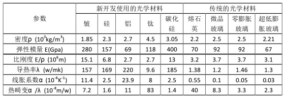 目前,國際常用的反射鏡材料包含了熔石英、微晶玻璃、碳化硅、聚合物薄膜以及碳化硅復合材料等幾大類,采用輕量化技術在材料制造加工、結(jié)構(gòu)設計等方面進行優(yōu)化,盡可能在提升性能的同時減輕其本身的重量。因此,輕量化反射鏡被看作空間遙感以及天文、深空探測光學系統(tǒng)的核心部件,理想材料應具有低密度、高彈性模量、低熱膨脹系數(shù)、高熱導率、均勻微觀結(jié)構(gòu)、無材質(zhì)缺陷等特點。