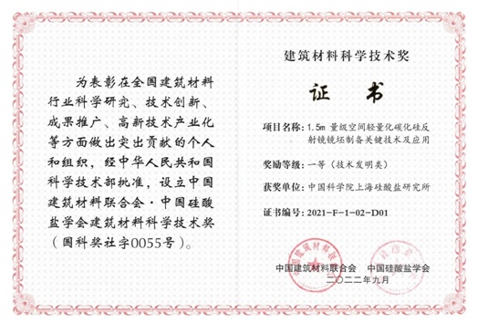 中國粉體網(wǎng)訊 近日,中國建筑材料聯(lián)合會•中國硅酸鹽學會在北京召開了2021年度“中國建筑材料聯(lián)合會•中國硅酸鹽學會建筑材料科學技術獎”頒獎儀式,授獎項目64項。中國科學院上海硅酸鹽研究所作為第一完成單位完成的“1.5m量級空間輕量化碳化硅反射鏡鏡坯制備關鍵技術及應用”項目榮獲2021年度建材材料科學技術發(fā)明獎一等獎。
