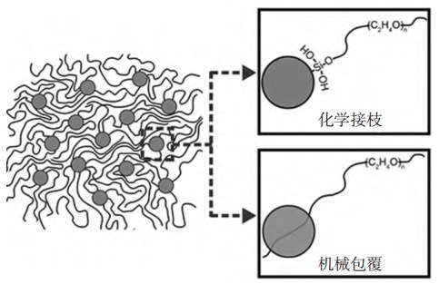 在加入納米顆粒用以提升聚合物電解質材料離子電導率研究過程中,研究人員不斷開發出新的改性方法。有研究者在添加傳統無機納米顆粒的基礎上,通過無機顆粒表面改性,將無機顆粒與PEO主鏈交聯,實現了復合網狀交聯聚合物電解質材料,該材料在60℃下達到了10-3S/cm的高離子電導率。