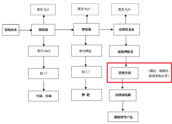 鹽湖提鋰生產電池級碳酸鋰最大難點在于鎂鋰分離、鈣鋰分離、硼鋰分離等問題。鎂鋰分離工藝成為鹽湖鹵水提鋰生產電池級碳酸鋰的關鍵所在。由于鎂鋰分離技術門檻高,導致我國電池級鋰鹽生產長期依賴進口鋰輝石精礦。近幾年國內鹽湖提鋰技術發展較快,但新開發的鎂鋰分離工藝仍然有其局限性。以下將以吸附法、萃取法、膜分離法、煅燒法為例,對鎂鋰分離工藝難點作簡要分析。