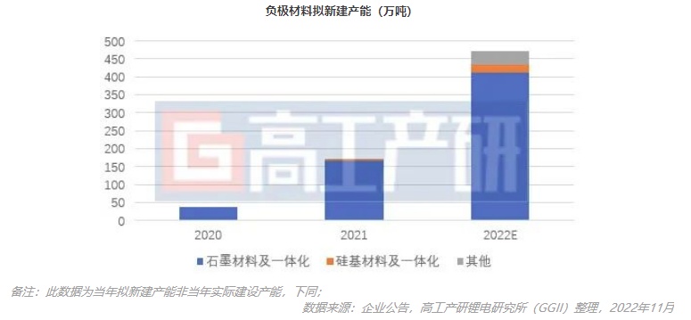 1)2023年負(fù)極材料市場投資會趨于冷靜。2022年以前整個行業(yè)對市場前景預(yù)期較為樂觀,為搶占市場份額,企業(yè)產(chǎn)能規(guī)劃超前,負(fù)極材料擬新建產(chǎn)能已遠(yuǎn)超市場需求,規(guī)劃總產(chǎn)能達(dá)需求的5倍,產(chǎn)品價格下滑,未來將出現(xiàn)產(chǎn)能結(jié)構(gòu)性過剩。GGII預(yù)計2023年行業(yè)擬新建項目投資額將下滑到800億以內(nèi),且已簽約項目建設(shè)進(jìn)度可能慢于預(yù)期。