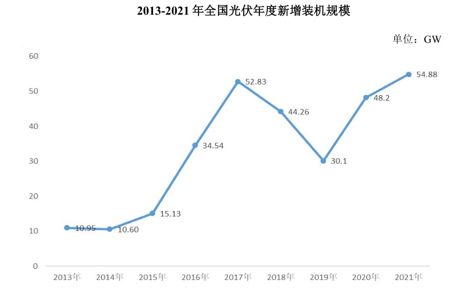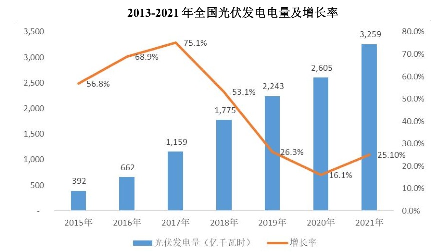 根據國家能源局數據顯示,2021年我國光伏發電量3259億千瓦時,同比增長25.1%,繼續保持高速發展的態勢。光伏市場方面,2021年全國新增光伏并網裝機容量54.88GW,同比上升13.9%。累計光伏并網裝機容量達到308GW,新增和累計裝機容量均為全球第一。全年光伏發電量為3259億千瓦時,同比增長25.1%,約占全國全年總發電量的4.0%。