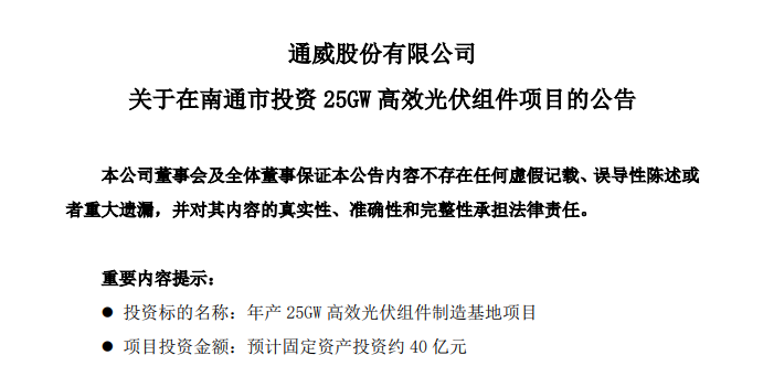 中國粉體網訊 千億光伏龍頭通威股份(600438)12月12日晚間公告,公司擬與南通市經濟技術開發區管理委員會簽署《高效光伏組件制造基地項目投資協議書》(下稱“《投資協議》”),就公司在南通開發區投資建設年產25GW高效光伏組件制造基地項目達成合作。