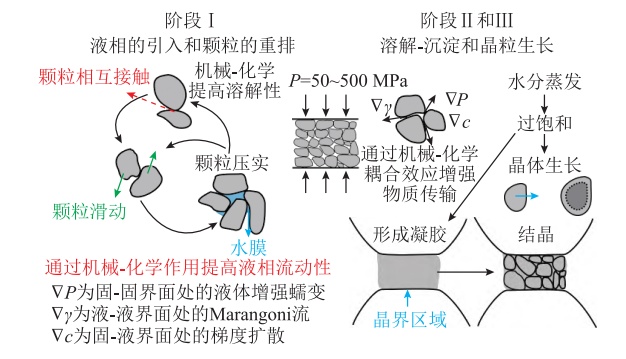 冷燒結機制和冷燒結過程中陶瓷顆粒微觀結構的演變示意圖