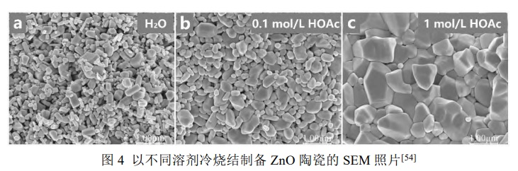 Funahashi等首次采用冷燒結技術制備了ZnO陶瓷,采用乙酸溶液作為瞬態液相,300℃燒結后,試樣致密性達98%,電導率與傳統1400℃燒結材料相當,模擬計算的冷燒結晶粒生長活化能為43kJ·mol-1,遠低于常規燒結報道值。