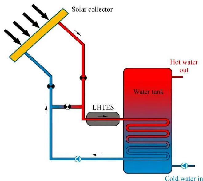 最后討論了基于Gr的相變材料在太陽能領域的應用。太陽能熱電廠中的Gr基相變材料和Gr涂層利用蒸汽的直接產(chǎn)生和簡單的再熱朗肯循環(huán)來儲存熱能,由于相變材料中存在導熱系數(shù)非常高的Gr,可以顯著縮短充放電時間。集中式太陽能熱電廠的示意圖如圖2所示。另外還有太陽能熱水系統(tǒng)中基于Gr的相變材料,太陽能熱水器在白天收集太陽能加熱熱水,Gr基相變材料吸收熱能并儲存。在夜間,從基于GR的相變材料中回收熱能來加熱水。原理圖如圖3所示。除此之外還討論了基于Gr的相變材料在太陽能溫室、建筑、電池熱管理系統(tǒng)、電子散熱和熱能儲存方面的應用。