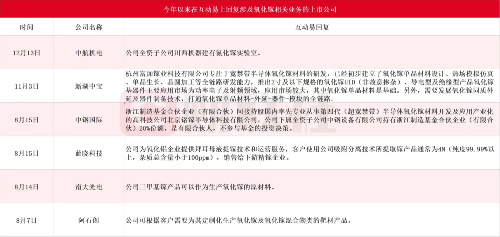 據不完全統計,今年以來多家上市公司紛紛在互動易上披露氧化鎵相關業務研發情況,涉及公司包括中航機電、新湖中寶、中鋼國際、藍曉科技、南大廣電、阿石創等,具體如下: