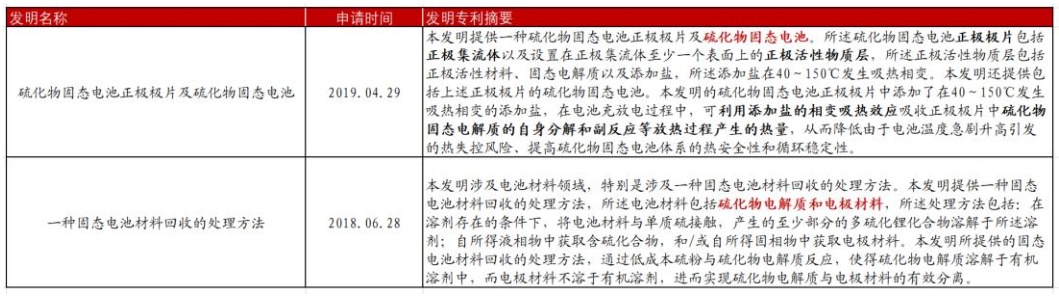 寧德時(shí)代在2018-2019年間的主要技術(shù)路線以硫化物固體電解質(zhì)為主。專利公布了硫化物固態(tài)電池的回收技術(shù)和一種正極具有吸熱相變添加鹽的硫化物固態(tài)電池,添加鹽的變相吸熱可以中和正極極片中硫化物固態(tài)電解質(zhì)的自身分解和副反應(yīng)等放熱過(guò)程產(chǎn)生的熱量,降低了熱失控風(fēng)險(xiǎn)、提高了硫化物固態(tài)電池體系的熱安全性和循環(huán)穩(wěn)定性。