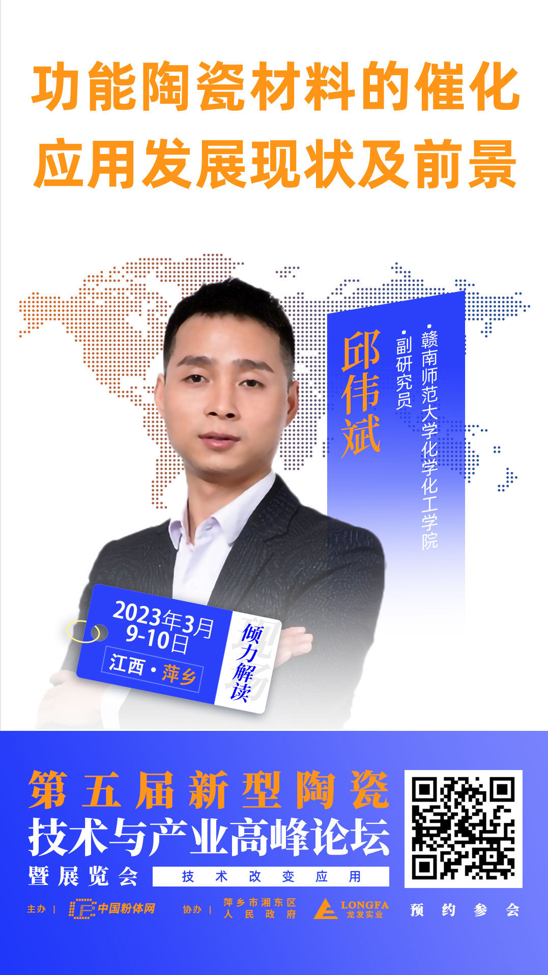 2023年3月9-10日,中國粉體網將在江西萍鄉舉辦“第五屆新型陶瓷技術與產業高峰論壇”,我們有幸邀請到贛南師范大學的邱偉斌副研究員作題為《功能陶瓷材料的催化應用發展現狀及前景》的報告。報告中,邱偉斌副研究員將結合當前發展現狀、不足及他們的研究基礎,對功能陶瓷材料在催化領域的發展趨勢進行展望,以期為研制高活性、高穩定性且低成本的光/電小分子轉換催化劑提供參考。