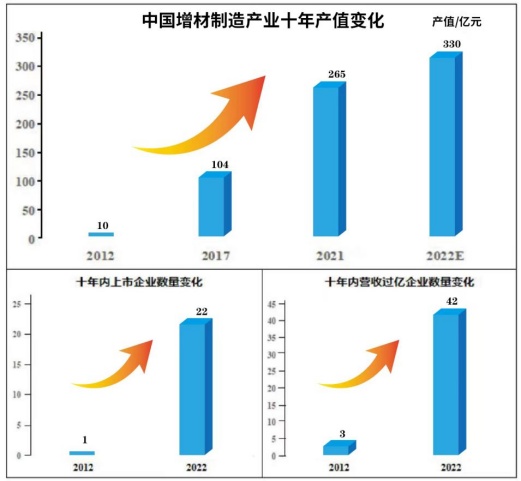 (一)整體實現(xiàn)從技術(shù)化向產(chǎn)業(yè)化發(fā)展的蛻變。十年來,我國增材制造無論是在基礎(chǔ)研究、關(guān)鍵技術(shù),還是成果轉(zhuǎn)化等方面都取得了飛速發(fā)展,增材制造技術(shù)及產(chǎn)品逐步實現(xiàn)產(chǎn)業(yè)化,涌現(xiàn)出一大批具備強力競爭力的骨干企業(yè)。產(chǎn)業(yè)規(guī)模方面,我國增材制造產(chǎn)業(yè)規(guī)模從2012年的不足10億元擴大到2021年的265億元,十年來增速超過20余倍,年復合增長率超過35%。企業(yè)數(shù)量方面,經(jīng)過十年的發(fā)展,我國增材制造全產(chǎn)業(yè)鏈相關(guān)企業(yè)超過1000余家,鉑力特、先臨三維、華曙高科等以增材制造為主營業(yè)務(wù)的上市公司涌現(xiàn),數(shù)量從2013年的1家增長至2022年的22家(含新三板),規(guī)模以上企業(yè)數(shù)量由2016年的20余家增至2022年的100余家,其中規(guī)模過億的企業(yè)數(shù)量由2012年的3家增至2022年的42家。