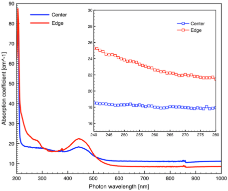 奧趨光電對化學機械拋光(CMP)后的2-3英寸AlN襯底進行了高分辨X衍射(HRXRD)搖擺曲線(見圖六)和深紫外吸收系數(見圖七)的表征。3英寸襯底的(0002)和(10-12)HRXRD搖擺曲線半高寬分別為176 arcsec和109 arcsec,表明具有較高的結晶質量。然而,隨襯底直徑的擴大,半高寬有所增大,表明質量略受影響。初步判斷是因為晶體擴徑過程中生長界面逐漸增強的徑向溫梯導致了各類缺陷(小角度晶界、穿型位錯、基底面位錯、堆垛層錯等)的產生與增殖。圖七顯示了用紫外-可見光分光光度計檢測的3英寸樣片在200-1000nm范圍內的吸收系數。襯底中心和邊緣位置的結果十分接近,表明具有較好的透光均勻性。在深紫外波段(240-280 nm),襯底片的吸收系數低至18-26 cm-1,表明具有優異的深紫外透過率。