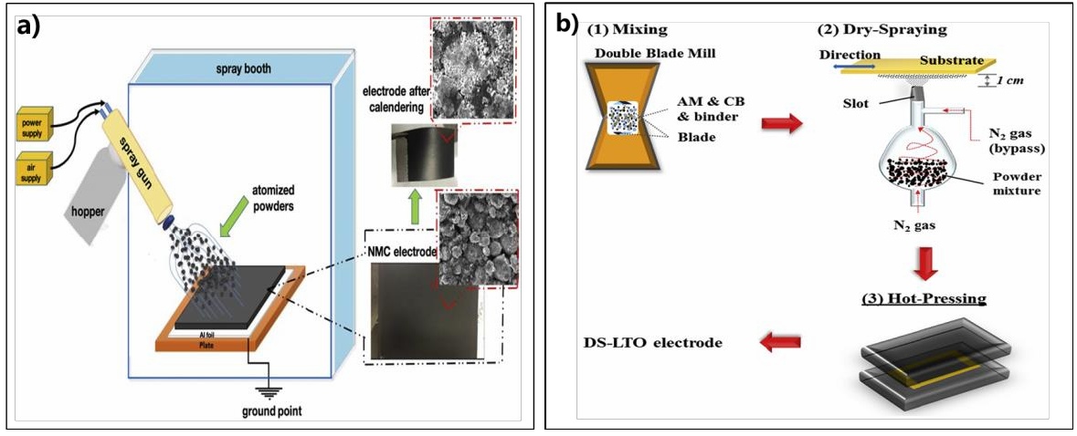 干法制備工藝通常是將活性物質、粘結劑、導電劑組成的粉末干混后,直接噴涂到集流體上,或者通過碾壓/熱壓制成自支撐的極片。由于不需要進行溶劑干燥過程,這種簡化的流程不僅可以降低成本,還有利于控制極片的微結構。目前,干法電極的研究主要有以下兩種開發策略:
