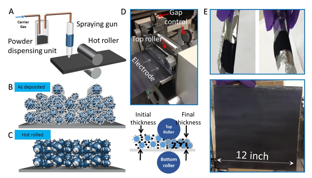 (A)靜電噴涂工藝系統;(B)(C) 熱錕壓前后;(D) 熱輥壓配置;(E)鋁箔上的干電極(來源:LUDWIG B,et al,《Solvent-free manufacturing of electrodes for lithium-ion batteries》)