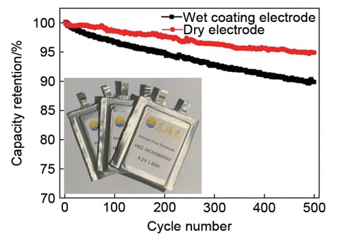 郭德超等采用錕壓法制備NCM811干法電極片,作為對比,采用傳統的濕法涂布工藝制備NCM811濕法電極片。然后分別通過紐扣半電池和軟包全電池對兩種電極片的電性能進行了考察。結果表明,在干法電極內部形成了一個致密、完整、柔性的黏結劑網絡結構,采用干法電極的軟包電池經500圈循環充放電后,容量保持率為94.89%,相較于傳統的濕法涂布電極提高了約5個百分點。干法電極中由PTFE纖維鏈構成的三維網絡結構,可以有效抑制活性物質顆粒在充放電過程中的體積膨脹,防止活性物質顆粒在循環過程中從集流體表面脫落。