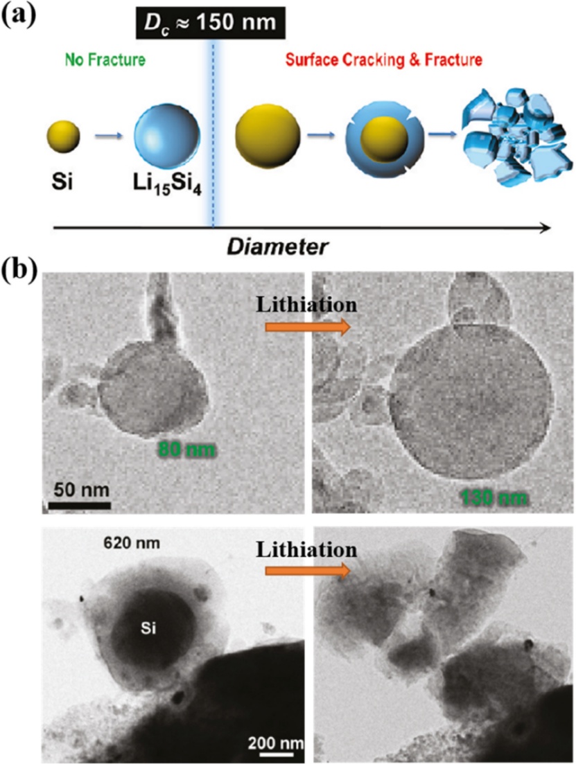 【圖1】(a)硅納米顆粒直徑和碎裂之間關系的圖示;和(b)鋰化后不同直徑的硅納米顆粒的TEM圖像。