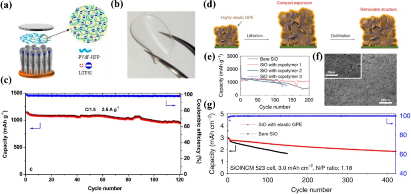 由于室溫下固態電解質與電極之間電導率低、界面差的棘手問題,研究人員提出了一種固液混合態電解質,用于液體電池和固態鋰離子電池之間的過渡。準固態電池使用液態有機溶劑復合聚合物基質凝膠電解質,可以有效解決界面接觸問題,降低界面電阻。Pandey等人使用聚偏氟乙烯-六氟丙烯(PVDF-HFP)作為基體凝膠電解質和碳包覆硅基負極組裝電池,獲得了良好的電化學性能(圖6a,b)。構建的電解質膜具有良好的熱穩定性和機械性能。室溫下離子電導率可達2.2×10-3Scm-1。在電化學循環過程中,柔性凝膠電解質能與電極形成良好的接觸,因此能有效適應硅基負極在循環過程中的巨大體積變化,從而保持良好的電化學穩定性。100次循環后,在2600mAg-1的電流密度下仍可保持1050mAhg-1的比容量,保持率為88%(圖6c)。Wang的研究小組使用聚(聚(四亞甲基醚)二醇-共-4,4′-亞甲基二苯基二異氰酸酯)-乙烯來構建具有良好離子電導率(25°C時為2.4×10-4Scm-1)和硅負極兼容性的凝膠電解質(圖6d)。在與高負載SiO負極匹配的半電池測試中,其在150次循環后具有1068mAhg-1的可逆比容量,這與未改性的電極相比是顯著的改進(圖6e)。SEM圖像還顯示,在多次循環后,電極表面沒有明顯的開裂現象(圖6f)。高負載硅基負極全電池的長循環結果也證明了這種超彈性凝膠聚合物電解質的優異性能。在350次循環后,其仍具有70.0%的容量保持率,顯示出良好的穩定性(圖6g)。