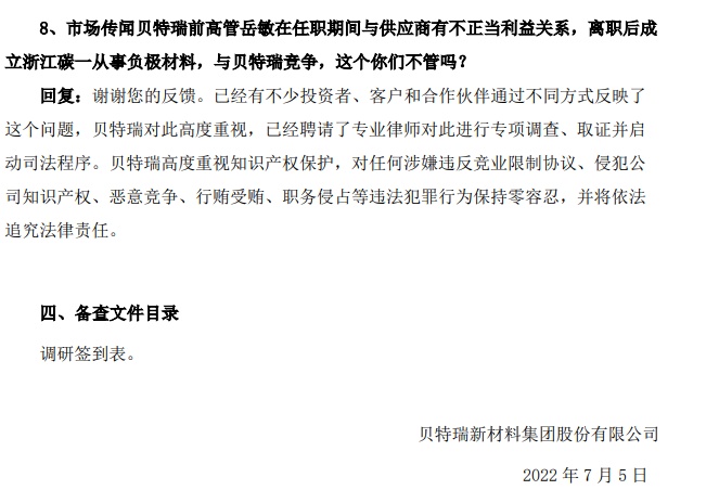 另外,值得一提的是,碳一新能源創始人岳敏此前曾擔任負極材料龍頭貝特瑞的總經理。貝特瑞曾在接受機構投資者調研時回應岳敏從公司離職創立碳一新能源一事。