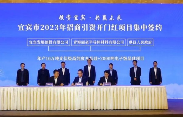 2023年1月6日,麗豪半導(dǎo)體三期10萬噸高純晶硅綠色能源項目簽約儀式在四川省宜賓市隆重舉行,宜賓發(fā)展創(chuàng)投有限公司、珙縣人民政府與青海麗豪半導(dǎo)體材料有限公司共同簽署年產(chǎn)10萬噸光伏級高純度多晶硅+2000噸電子級晶硅項目。