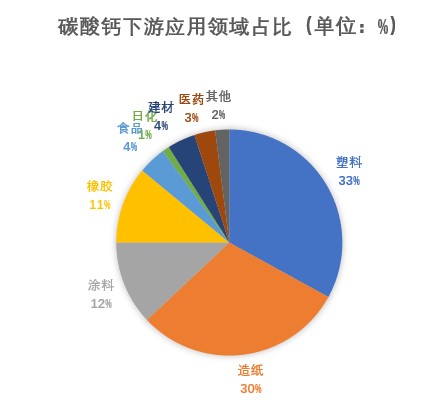 目前我國碳酸鈣下游應用市場中,塑料行業和造紙業是最大的應用領域,分別占比約33%、30%,涂料行業和橡膠行業占比約8%,飼料行業占比達6%,建材、食品、日化、醫藥等分別占比約3~4%。