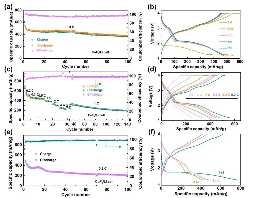 Li/LLZTO/FeF3和Li/LLZTO/CuF2固態電池的循環和倍率性能