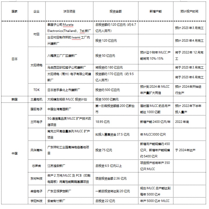 面對(duì)這些新增的挑戰(zhàn),日系企業(yè)也開啟一系列的擴(kuò)產(chǎn)項(xiàng)目。其中,村田從2021年11月至今發(fā)布3項(xiàng)擴(kuò)產(chǎn)計(jì)劃,部分將于2023年3月完成;太陽誘電目前在建擴(kuò)產(chǎn)項(xiàng)目也多達(dá)3項(xiàng),其中一項(xiàng)位于中國常州。值得注意的是,在多個(gè)MLCC項(xiàng)目擴(kuò)產(chǎn)中都指向車規(guī)級(jí)領(lǐng)域。