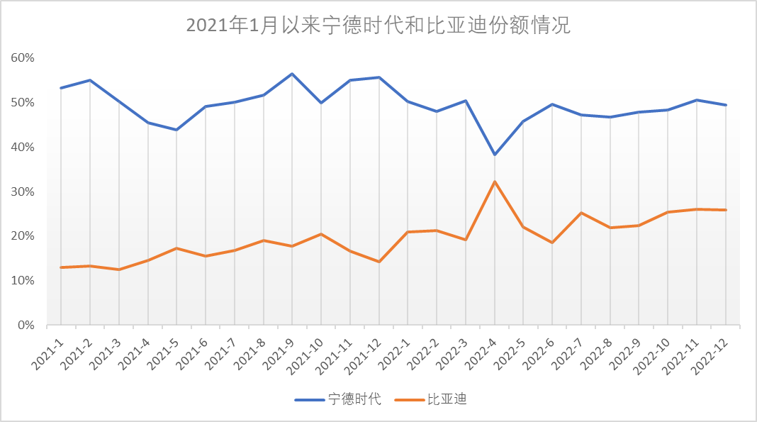 動力電池裝機量的市場份額總體變得比較穩(wěn)定,寧德時代在50%左右,比亞迪在25%左右。
