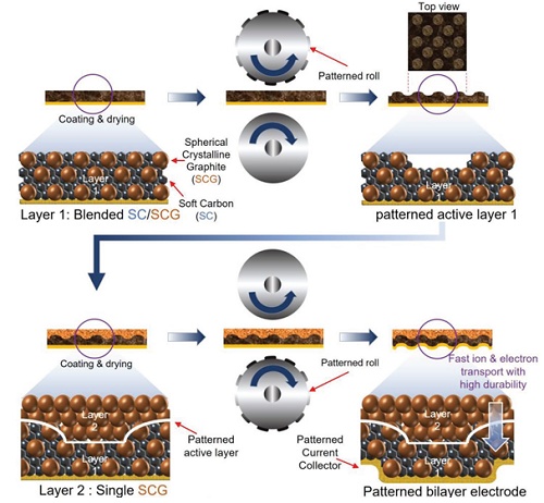 為了開發一種即使在鋰離子電池電極很厚的情況下也能保持高性能和可靠性的設計和加工技術,研究團隊開發了雙層陽極。陽極設計有凹槽,允許在高容量材料之間放置改進的離子傳導性和導電性的小材料。